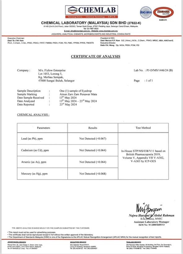 Dengan hasil daripada CHEMLAB ini, anda boleh gunakan Ainun ZamZam tanpa was-was.